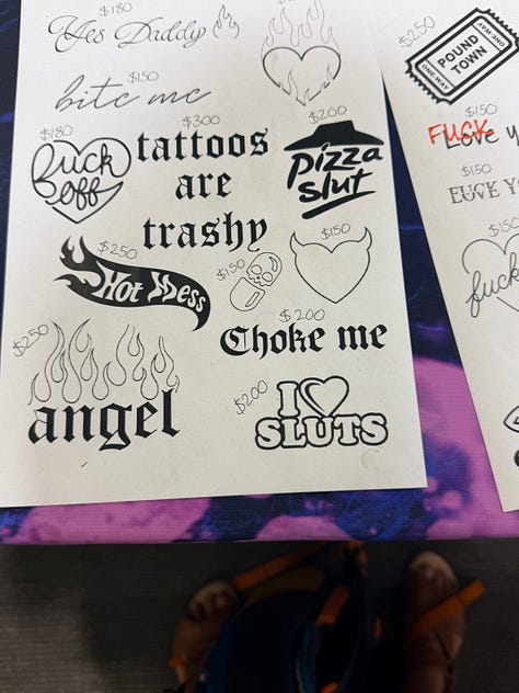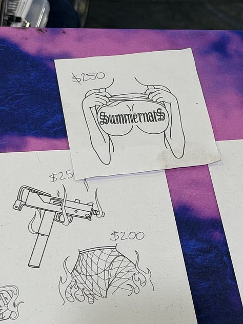 In one of the pavilions, half a dozen tattoo artists were taking walk in appointments. The flashes had phrases like “I love sluts”, “pound town”, or, my personal favourite, “ya dog cunt”. I spoke to one young man who got his first tattoo at that booth. He chose a picture of a woman pulling up her shirt and flashing her boobs. SUMMERNATS was written across her chest.